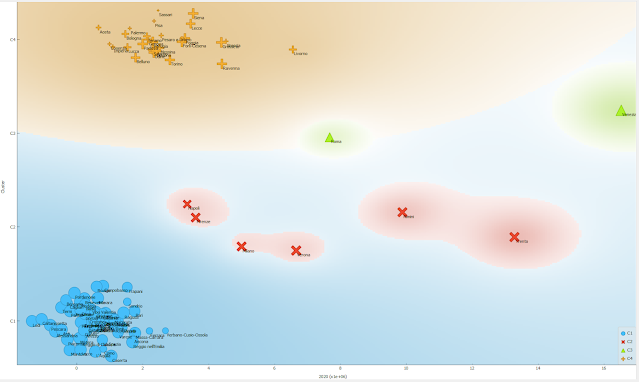 Dal punto di vista della mediana risulta il seguente ordinamento dei cluters ovvero: C3=12.201.125>C2=6.058.094>C4=2.435.597>C1=599.903. Diciamo che dal punto di vista geografico c’è una dominanza di Venezia e Roma che totalizzano il numero massimo di presenze turistiche, laddove invece le province del Cluster 2-C2 hanno dei buoni risultati ovvero Firenze, Verona, Napoli, Milano, Trento e Rimini. Al terzo posto vi sono alcune province virtuose del Centro, Nord e Sud Italia. E nell’ultimo cluster vi sono le restanti province comprese molte delle province del Sud Italia. In questa mappa è possibile verificare che le province che vengono preferite sono quelle nelle quali insiste per la maggior parte il patrimonio artistico-monumentale e museale italiano. Al contrario le province che pure sono ricche di bellezze naturalistiche non attirano altrettanti turisti rispetto ai centri cittadini avanzati. Ne deriva pertanto che il turista preferisce le città alle spiagge, l’arte al divertimento, e la dimensione monumentale alla semplice offerta turistica commerciale. Ovvero il turista che visita l’Italia è un turista che cerca la bellezza dei luoghi, delle opere d’arte e che invece è scarsamente interessato alla dimensione del paesaggio. Vi sono tuttavia delle eccezioni come per esempio Rimini, una città che riesce ad attirare turisti grazie all’investimento nelle strutture ricettive. Ne deriva che per le province che sono molto arretrate la soluzione per incrementare il numero dei turisti è semplice: investire nelle infrastrutture turistiche, nei servizi turistici. Ovviamente tale condizione richiede un passaggio di scala anche nell’investimento, passare dalle piccole e medie imprese del turismo del bed and breakfast a degli investimenti più rilevanti che possano comportare la costruzione di infrastrutture pronte all’accoglienza di centinaia se non migliaia di persone, in modo compatibile con il rispetto dell’ambiente.